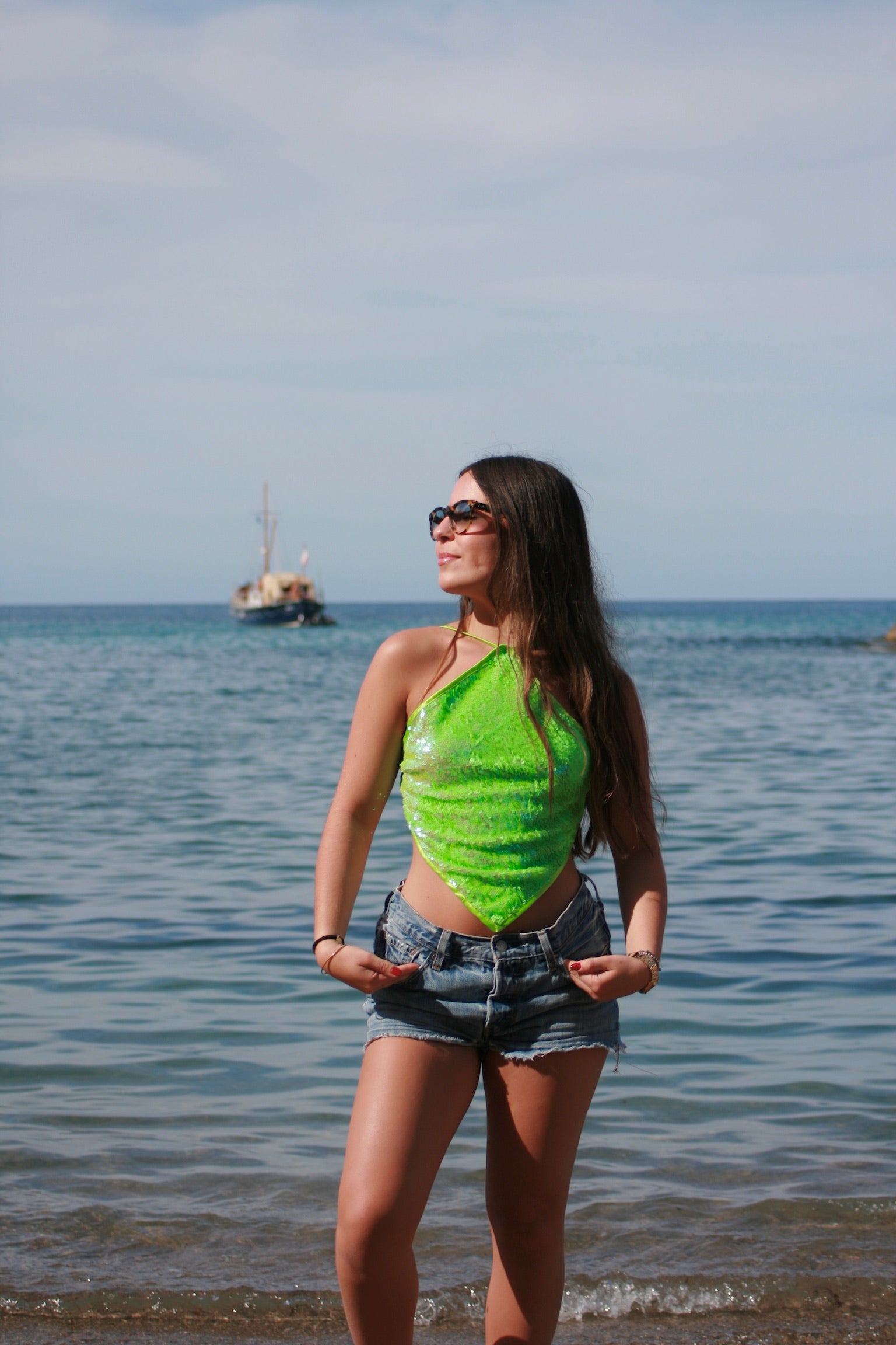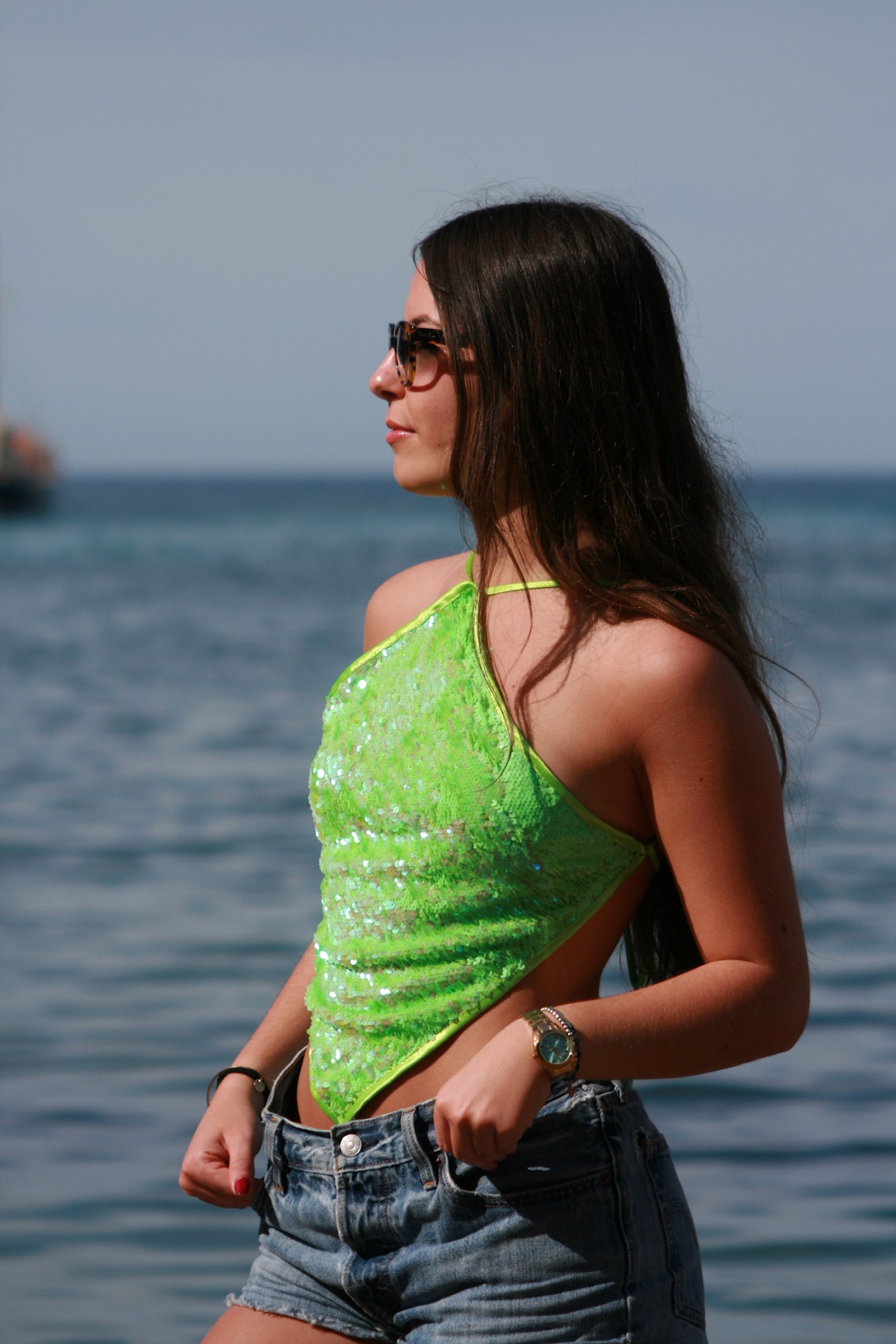 Top Kiwi es un diseño artesanal lleno de brillo gracias a sus lentejuelas verde neón. Su forma asimétrica y tirantes finos lo hacen perfecto para destacar. Espalda abierta con ajuste de cuerdas para un fit ideal. Ideal para noches de verano y looks atrevidos.