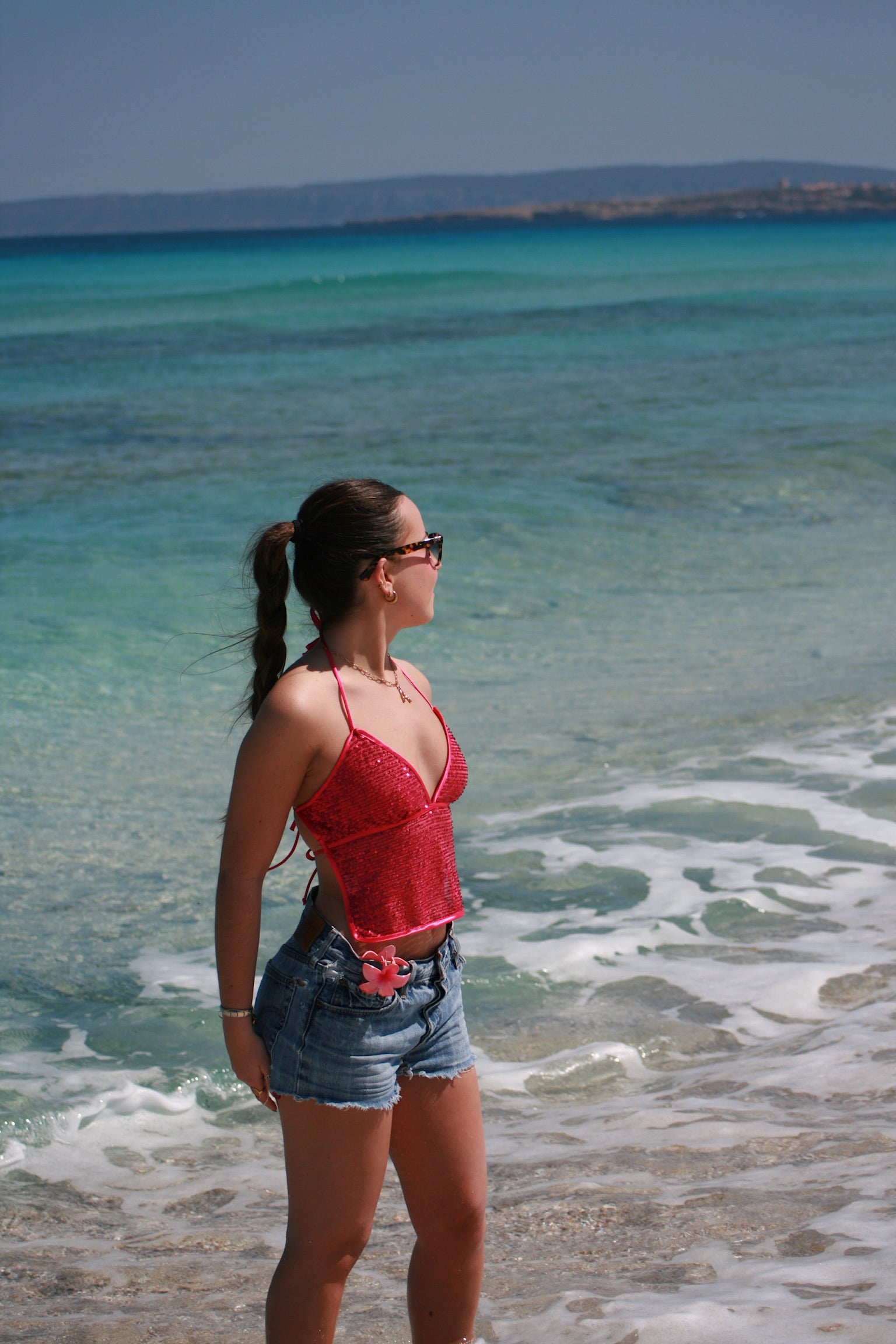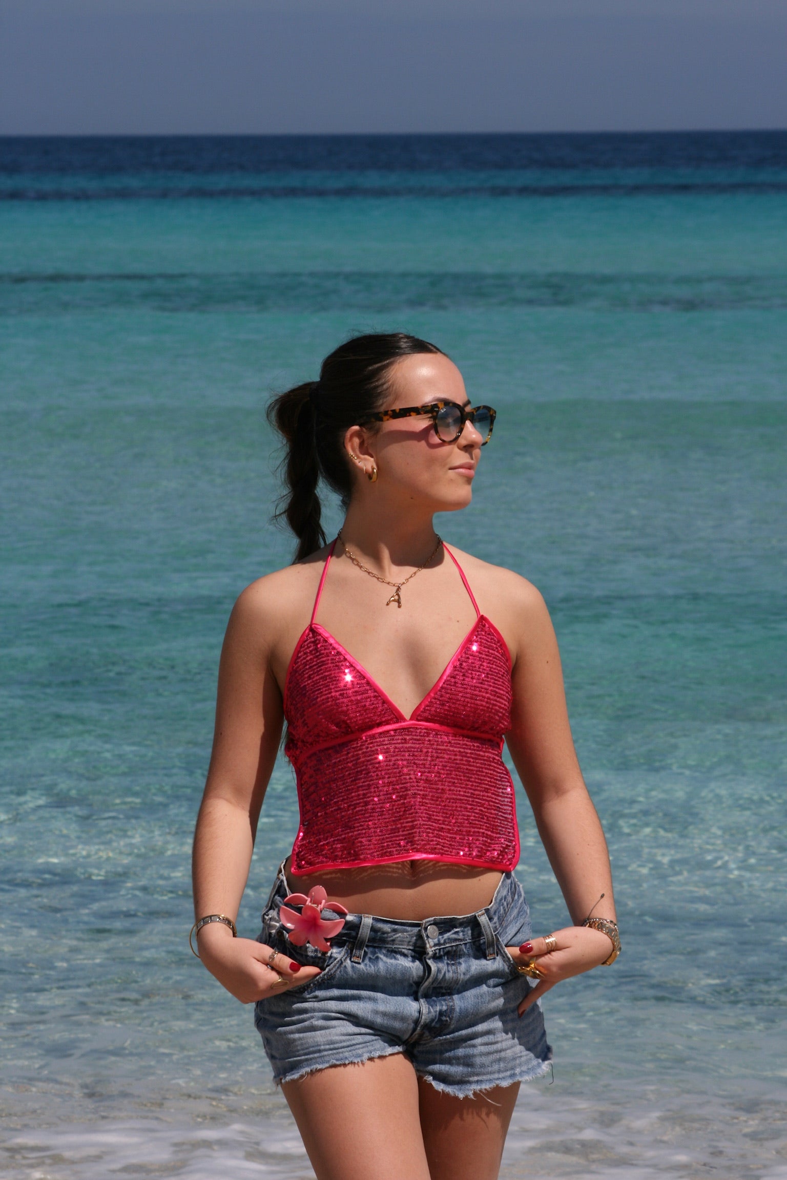 Top Cherry es un top hecho a mano con lentejuela rosa que capturan la luz con cada movimiento. Su escote favorecedor y espalda abierta lo hacen ideal para destacar en cualquier ocasión especial. Se ajusta con delicadas cuerdas que se atan en la parte trasera. Un diseño atrevido y femenino que roba miradas.