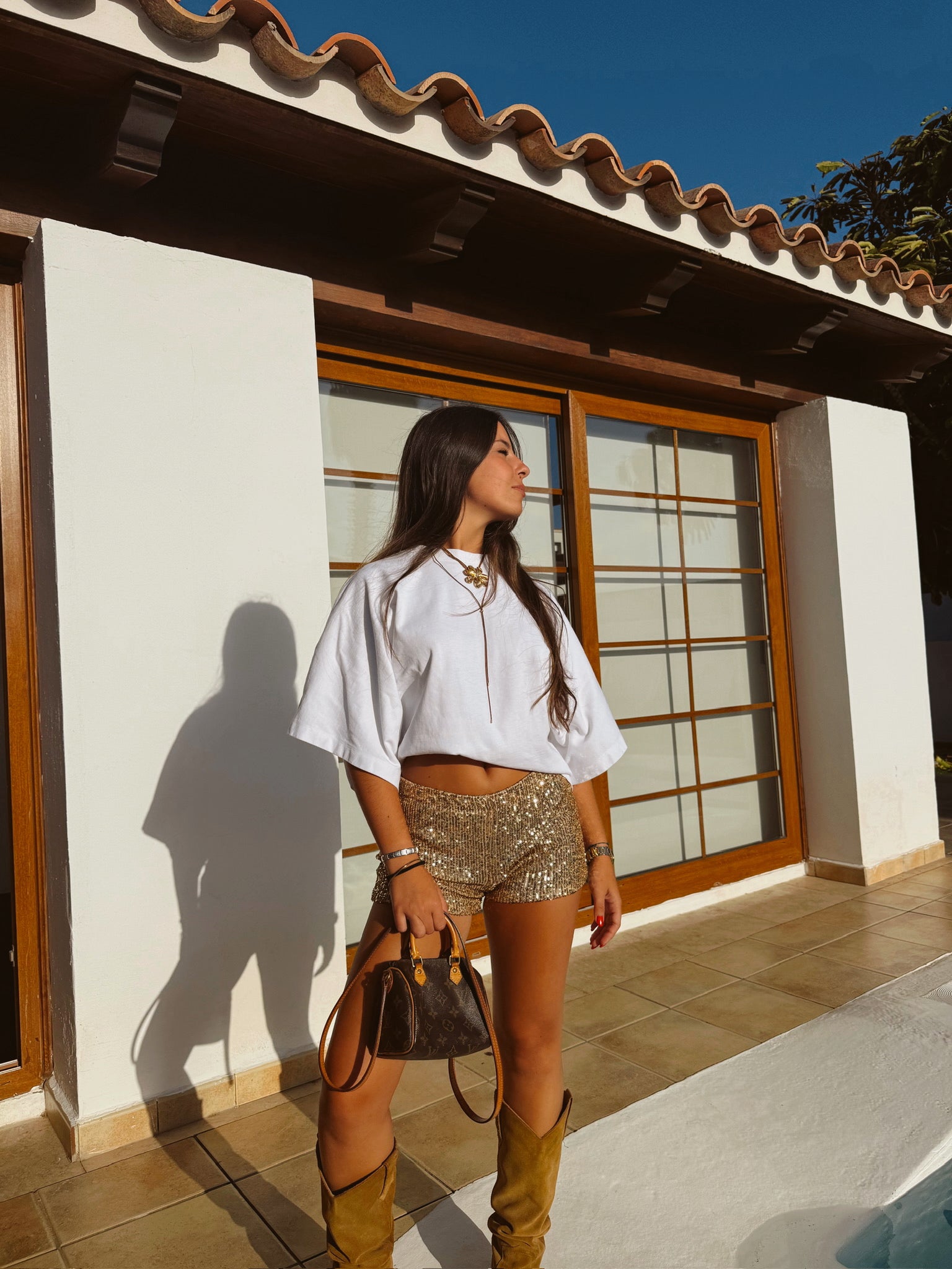 Short Sunset es corto de lentejuelas doradas hecho a mano. Brilla con cada paso gracias a su corte favorecedor y su ajuste cómodo. Un diseño atrevido y luminoso, perfecto para robar miradas.