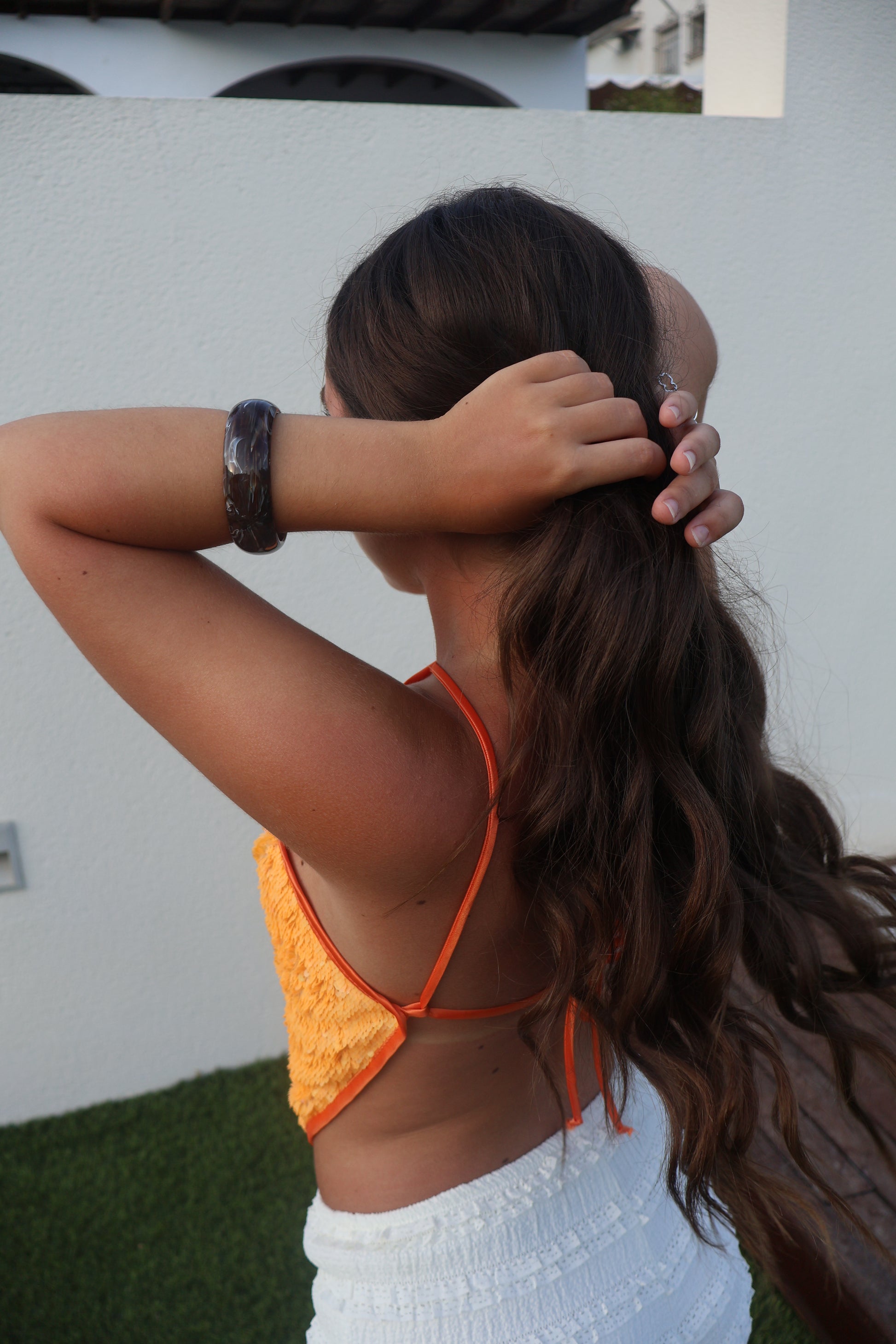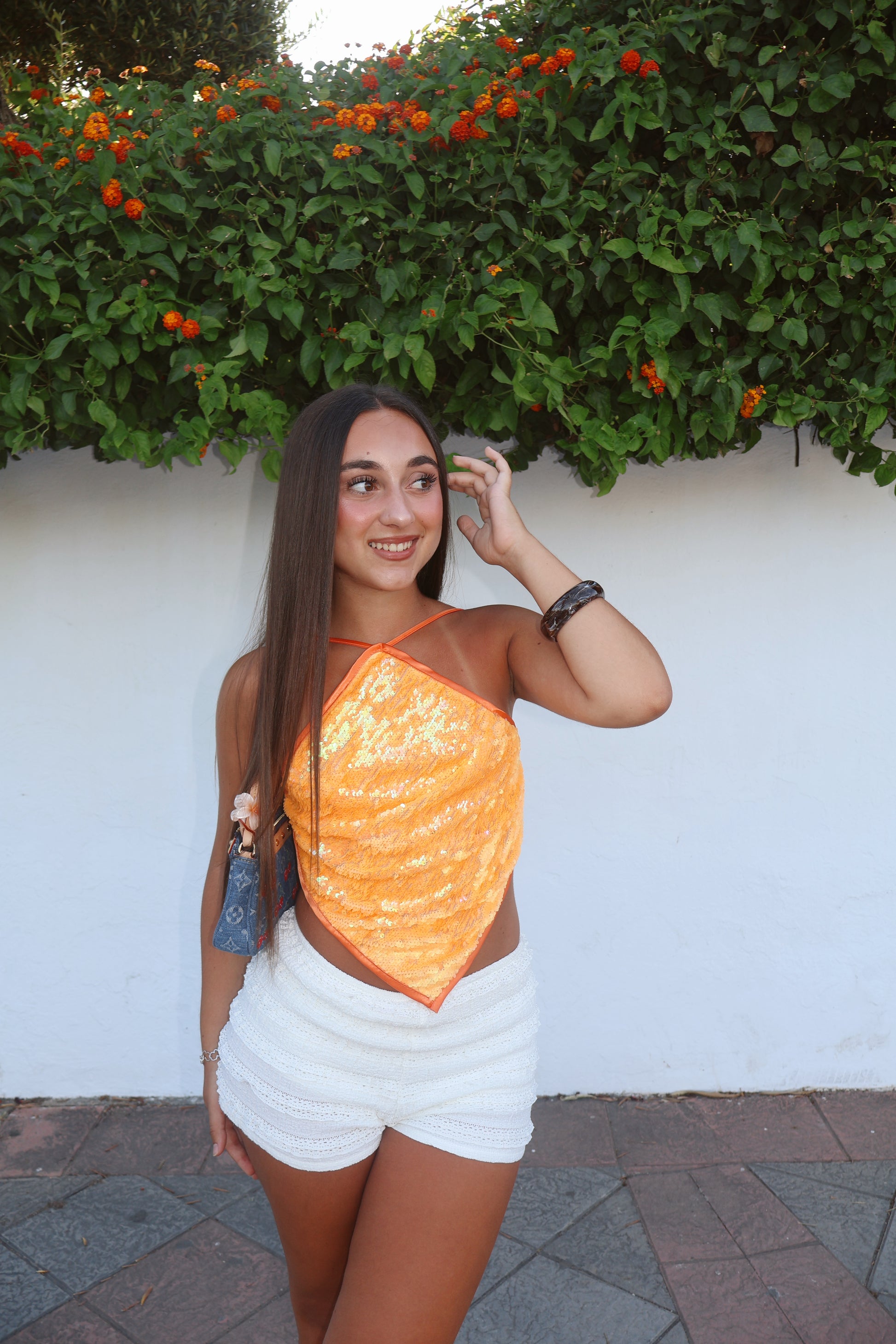 Top Peach es un diseño artesanal vibrante, confeccionado con lentejuelas en tono naranja que capturan la luz con cada movimiento. Su forma asimétrica y tirantes finos realzan la silueta y aportan un toque moderno. La espalda abierta con ajuste de cuerdas garantiza un fit perfecto. Ideal para looks audaces y atardeceres interminables.
