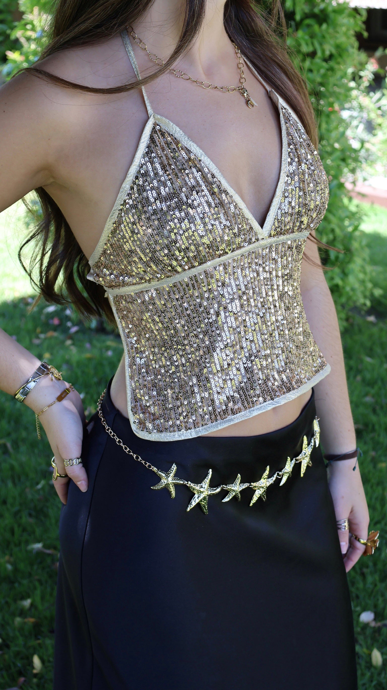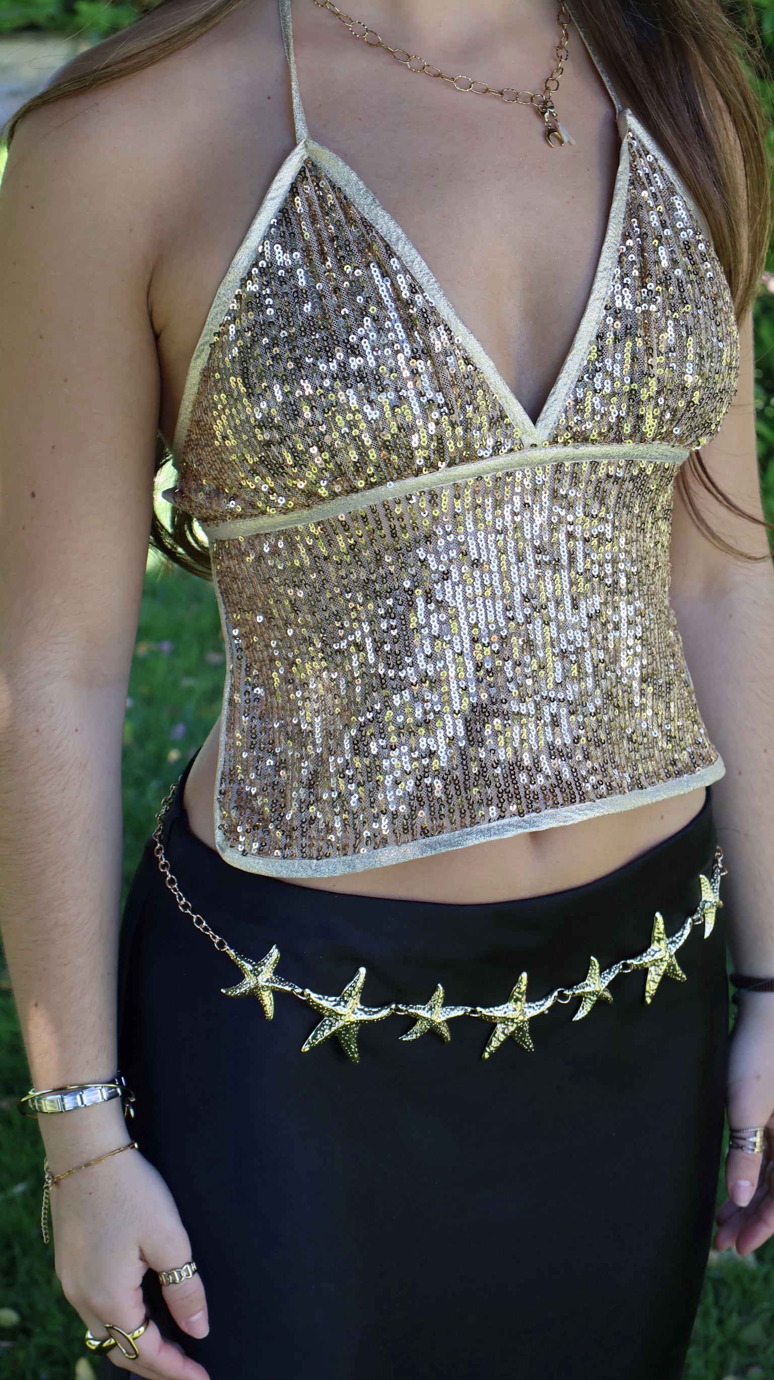 Top Sunset es un top hecho a mano con lentejuela dorada que capturan la luz con cada movimiento. Su escote favorecedor y espalda abierta lo hacen ideal para destacar en cualquier ocasión especial. Se ajusta con delicadas cuerdas que se atan en la parte trasera. Un diseño atrevido y femenino que roba miradas.